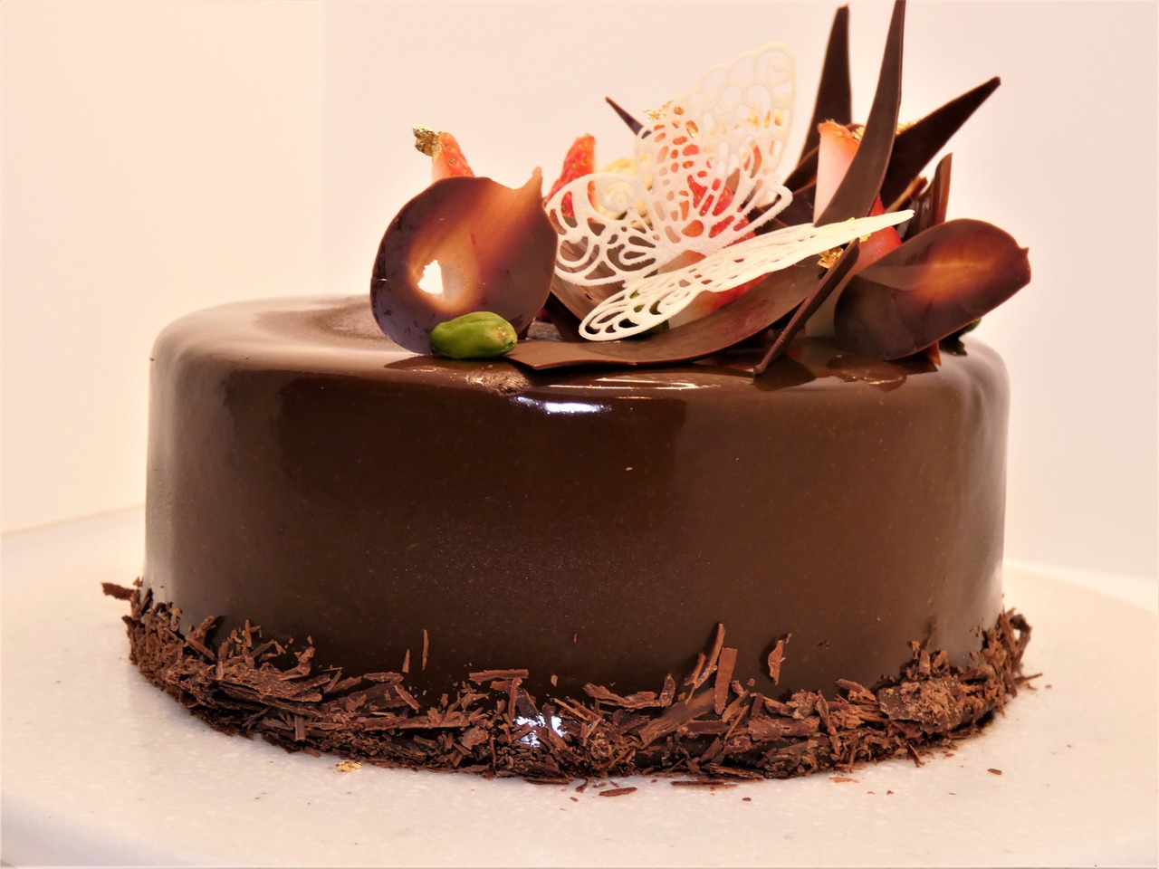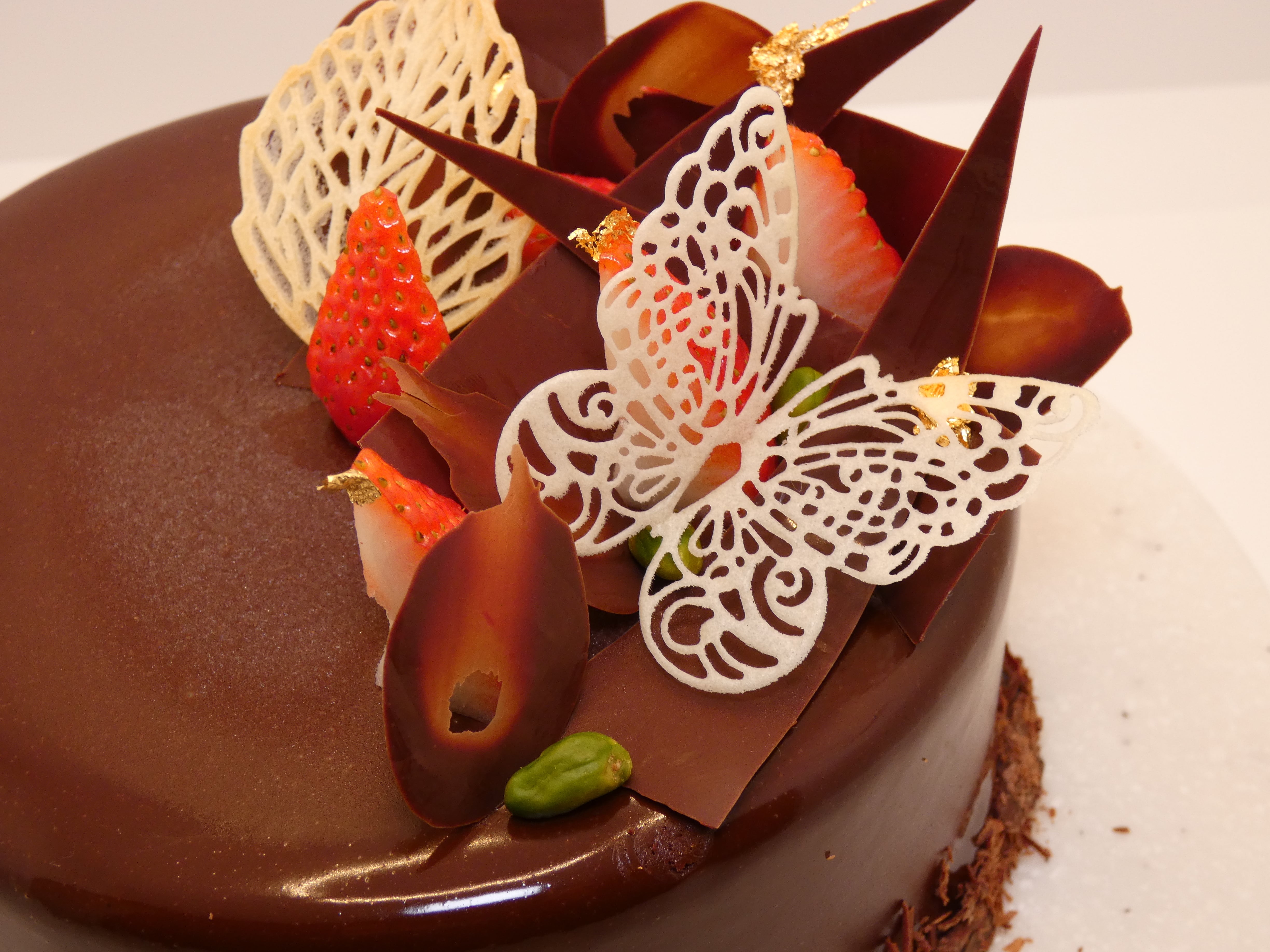濃厚なチョコレートムースの中に、苺のジャムとクレームブリュレを入れ、チョコレートソースでコーティングしてあります。